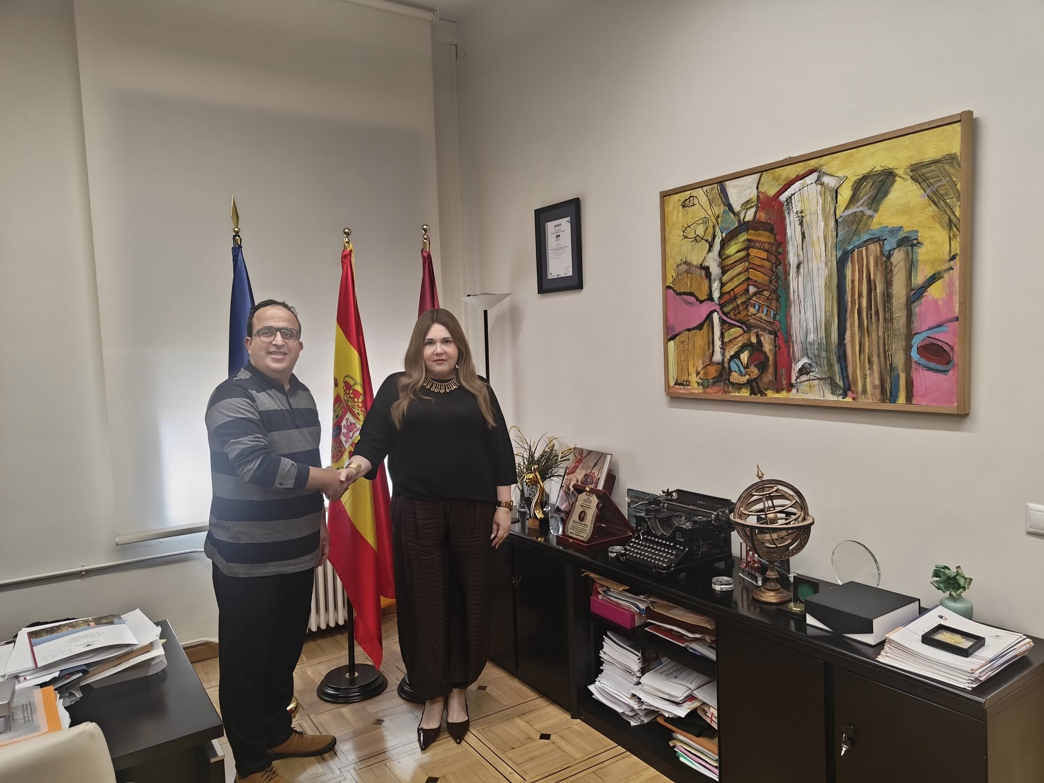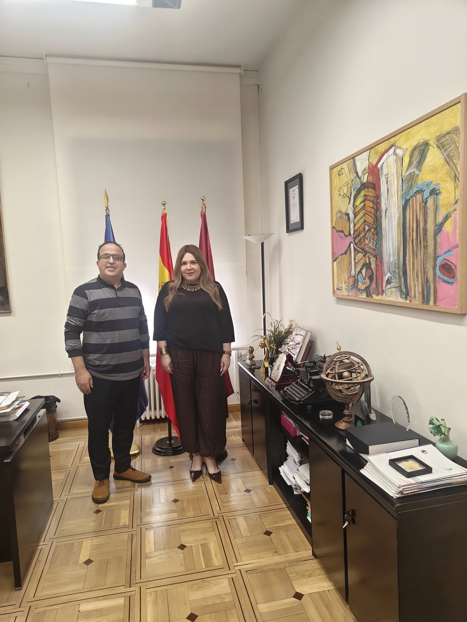 وخلال زيارته العلمية الحالية إلى إسبانيا كأستاذ زائر في عدد من الجامعات الإسبانية، التقى الأستاذ الدكتور إبراهيم العسال – نائب رئيس مجلس إدارة المعهد – بالعميدة بلاسكو، وهنأها شخصيًا على هذا الإنجاز الكبير، متمنيًا لها دوام التوفيق والنجاح في مهامها الجديدة
